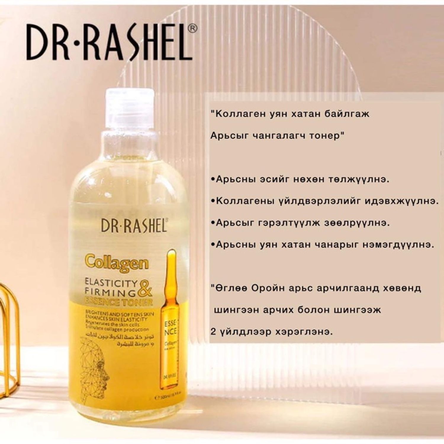 Коллагентой Тонер нь арьсны уян хатан байдлыг нэмэгдүүлж арьсыг чангалж гүн чийгшүүлнэ. Хөвөнд шингээн үлдэгдэл бохирдолыг цэвэрлэх болон алган дээр аван шингээх 2 үйлдлээр хэрэглэнэ. Эссэнц агуулсан байдлаараа бусдаас давуу талтай.