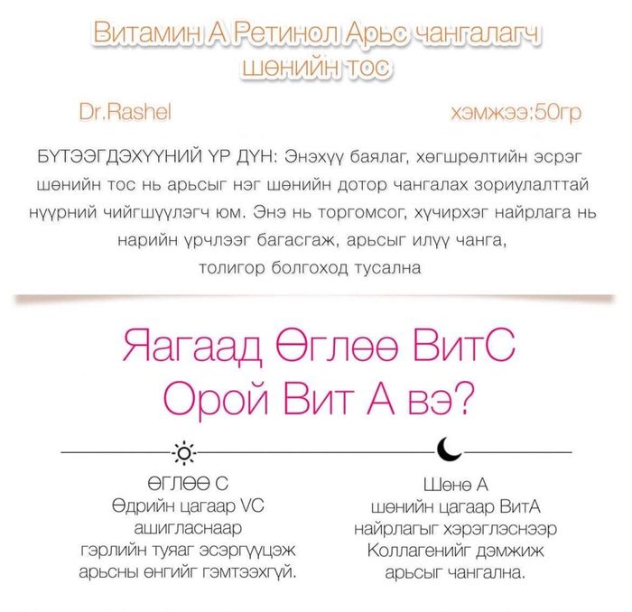 Витамин А ретинолтой хөгшрөлтийн эсрэг шөнийн тос нь арьсыг нэг шөнийн дотор чангалах зориулалттай нүүрний чийгшүүлэгч юм. Ретинолын торгомсог, хүчирхэг найрлага нь нарийн үрчлээг багасгаж, арьсыг илүү өнгөлөг чанга болгоно.